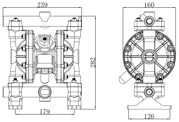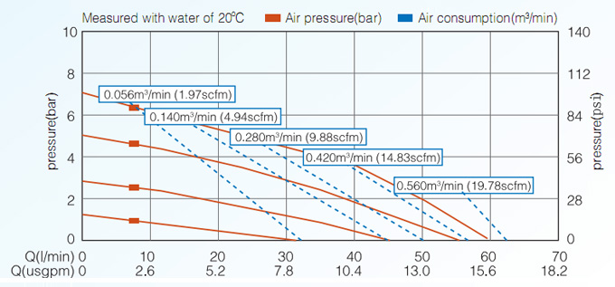 Max. Suction Lift Suction height changes with the different combinations of ball, seat and the diaphragm materials. | dry 4m wet 7.6m | Max. particle diamete | 2.5mm | suction and discharge size | 1/2 3/4in /Npt | Air inlet size | 1/4in | Max. flow rate | 57l/min | Max. head | 84m | Max. air inlet pressure | 8.4bar | Max. air consumption | 28scfm(0.672m³/min) | Main body material | Aluminnum alloy 304SST 316SST |